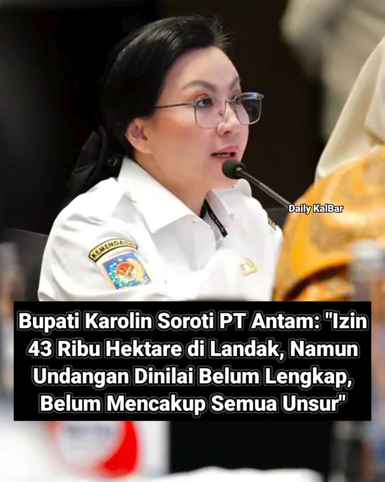 Bupati Kabupaten Landak, Karolin Margret Natasa, menyampaikan tanggapannya terkait keterlibatan Pemerintah Kabupaten Landak dalam agenda yang berkaitan dengan proyek strategis nasional (PSN) di Kabupaten Mempawah yang melibatkan PT Aneka Tambang Tbk (PT Antam)