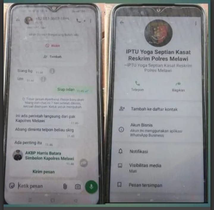 Baru-baru ini, nama Kapolres Melawi, AKBP Harris Bantara Simbolon, dan Kasat Reskrim Polres Melawi, IPTU Yoga Septian, dicatut oleh oknum tidak bertanggung jawab untuk melancarkan aksi penipuan melalui media sosial WhatsApp.